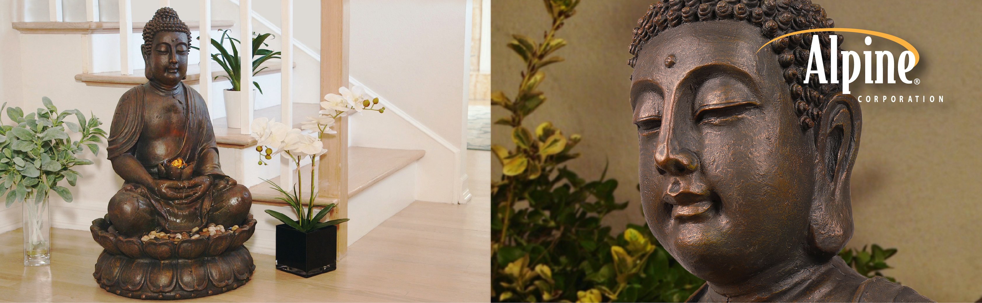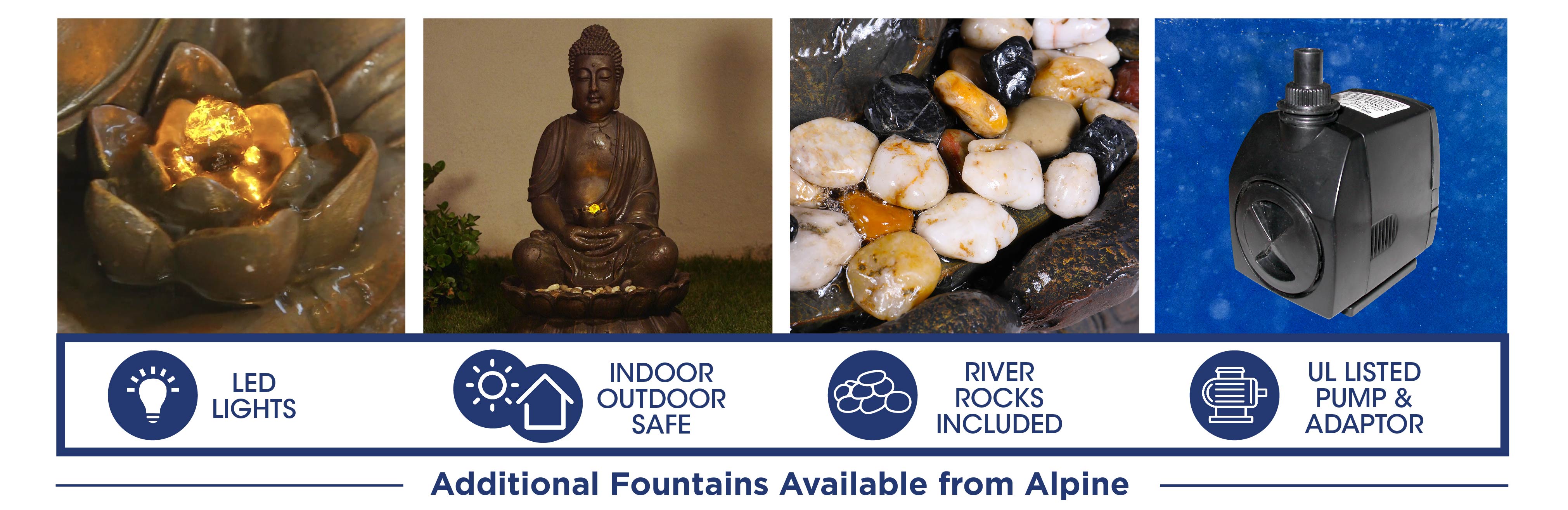 Add a touch of Zen to your indoor or outdoor space with the Alpine Corporation Meditating Buddha Statue Fountain. This stunning and serene Buddha statue is constructed with durable polyresin and stone powder materials but finished to look like aged stone. Unplug from the day and meditate to the sound of flowing water that falls over the LED lit lotus flower in Buddha's hands. The fountain is weather-proof, rust-resistant, and durable for years of quality use. With its antique-look, intricate details and portrayal of Buddha in meditative state, this Alpine fountain is sure to bring peace and tranquility to your home! The fountain is perfect for your garden, patio, deck, porch, or yard space. Looks great indoors, too! With a 1-year warranty, you can be confident in the quality of your purchase. Fountain measures 20"L x 20"W x 33"H for use in yards of any size. Alpine Corporation is one of America's leading designers, importers, and distributors of superior quality home and garden decor products. Alpine's award winning in-house design team continuously develops new and innovative "statements pieces" for your home and garden. Your outdoor living spaces will be the envy of the neighborhood with our wide assortment of fresh, fashionable and contemporary products, from beautifully crafted solar garden stakes featuring patented motion and fiber optic lighting technology to gorgeous glass and glow-in-the-dark bird baths and feeders.