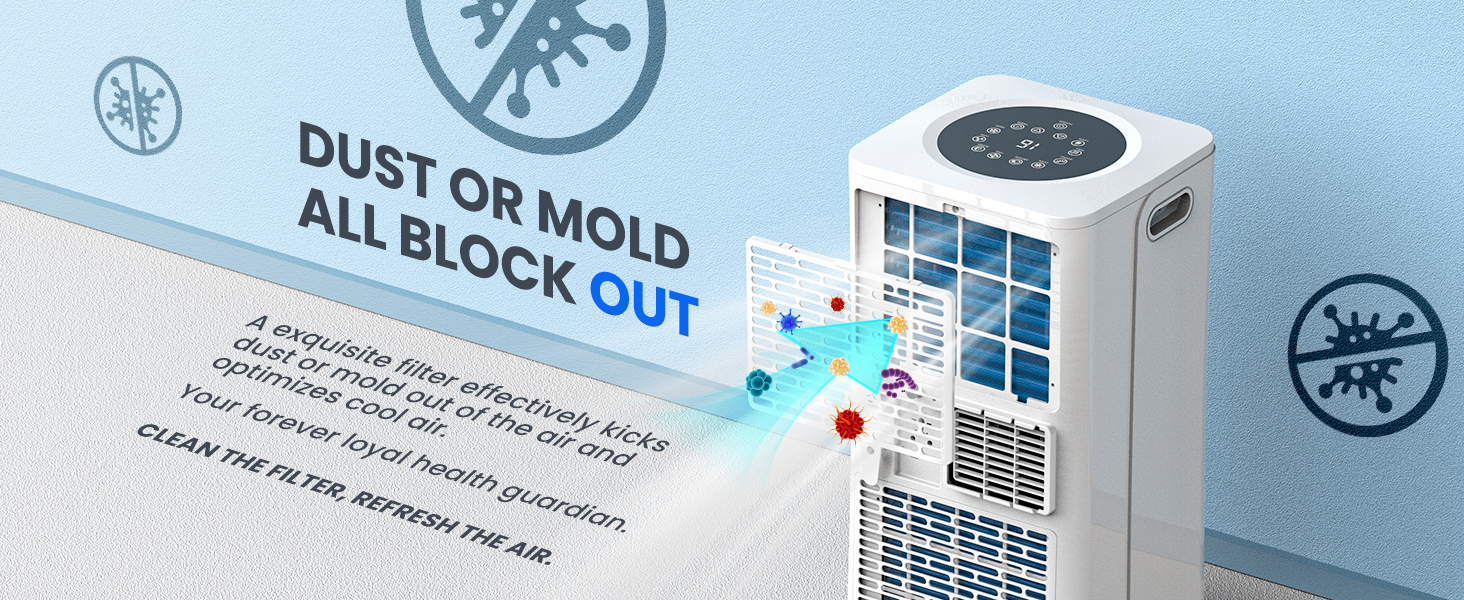 • ❄️【User-Friendly Design】Take control of your comfort with our 24h timer and versatile control options. Set your ideal temperature and mode effortlessly with our intuitive control panel or remote control. Choose startup and shutoff time to submerge yourself in cool air once getting into the room, greatly saving the energy. It is recommended to activate the child lock to keep little ones and pets safe from harm when the air conditioner is in operation. And with a washable air filter that can be washable and reused, maintenance for our air conditioner is a breeze. We recommend cleaning the air filter twice a month to ensure peak performance and cooling efficiency.