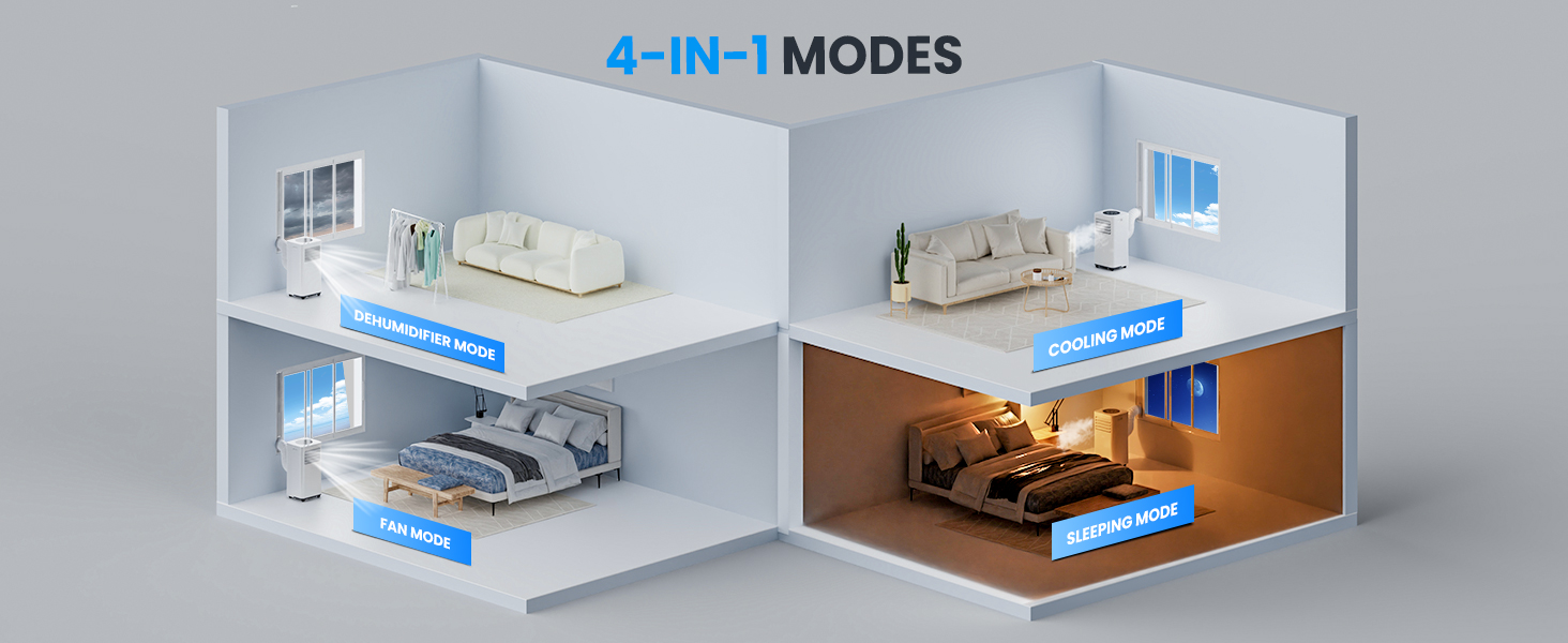 • 4️⃣【4-in-1 Multiple Functions】KGOGO air conditioner is designed specially to improve indoor air and offer year-round comfort. Beat the heat with our versatile air conditioner boasting four modes tailored for your comfort. From chilling in air conditioner mode to enjoying gentle breezes or strong cool winds in fan mode, and maintaining optimal humidity at 40%-60% RH with the dehumidifier mode ( This mode only works when the temperature is above 15℃ or the humidity is below 85% . ), and enjoying a deep ultra-quiet childlike sleep with light off and lower noise under our sleep mode, our air conditioner has you covered.