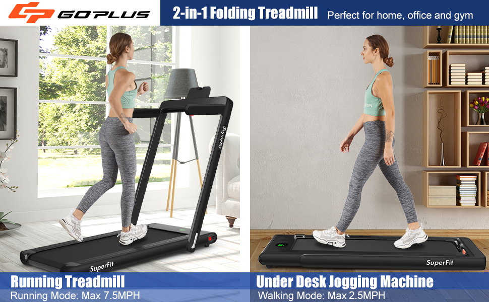 - INNOVATIVE 2-IN-1 FOLDING TREADMILL -- Compared to ordinary treadmills, our 2-in-1 Superfit treadmill has 2 modes to meet your different sports needs. When the riser is folded, it can be used as a jogging machine at a speed of 0.6MPH-2.5MPH, when the handrail is raised, the running speed is 0.6MPH-7.5MPH, and the speed unit could be switched between mile and km in APP.