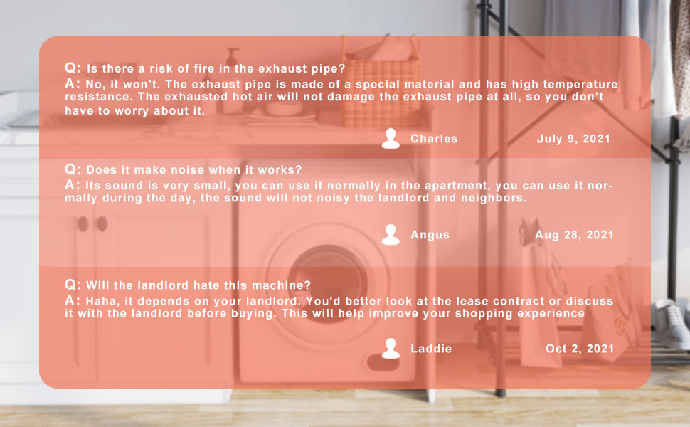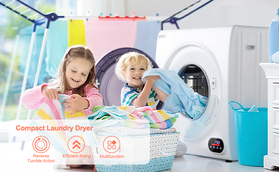 【Portable and safe】 With its compact size and handle, this portable dryer is ideal for small spaces such as apartments, dormitories, etc. It can be installed on a countertop, on a firm, level ground or mounted with a bracket (bracket not included). ETL and DOE certifications guarantee the safety and quality of our products.