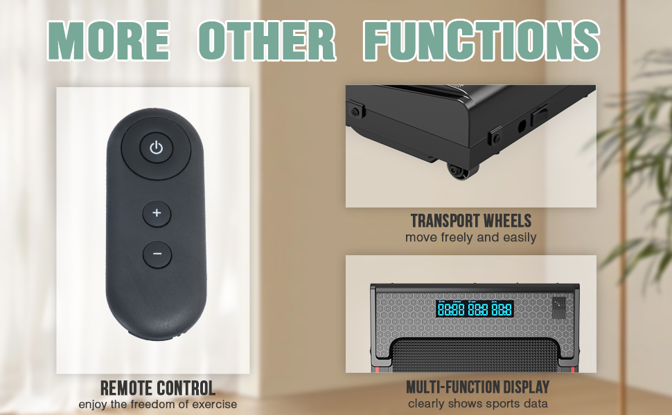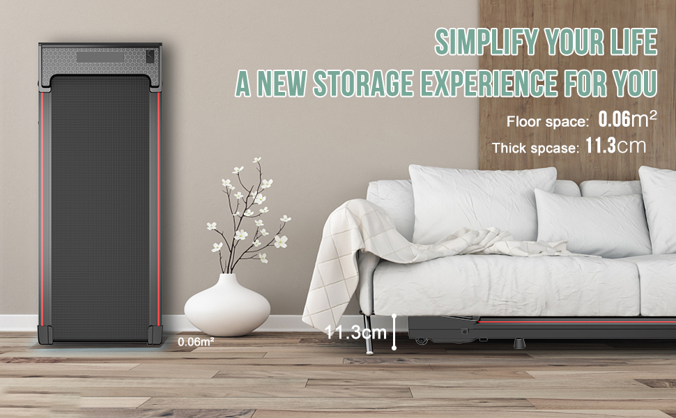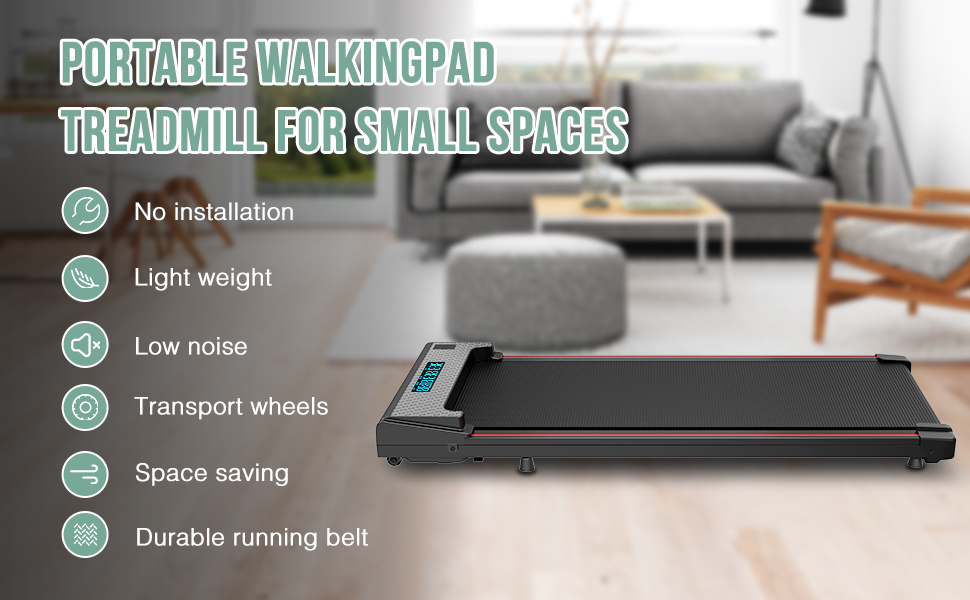 • 【Installation-Free and Space-Saving】 The compact and portable design of this treadmill requires no installation. It's ready to use right out of the box. This treadmill with its space-saving design and transport wheels makes it convenient to place it under a desk, in a corner, or even next to a sofa.